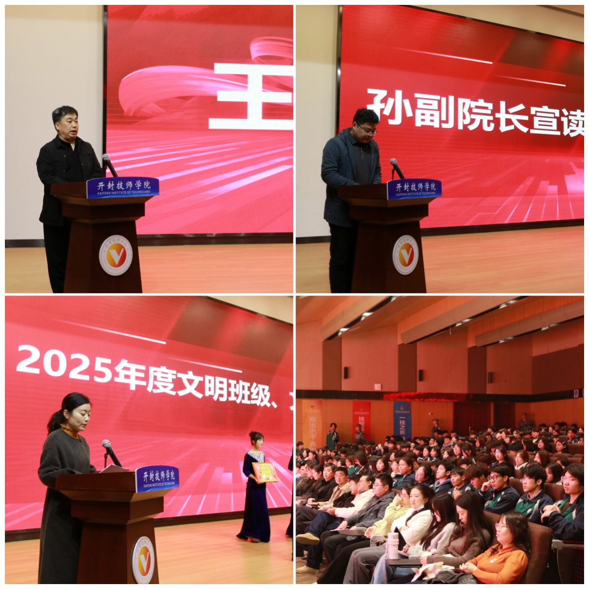 表彰环节将大会推向高潮。雷蕊宣读年度文明班级、文明教室、文明学生标兵、优秀学生干部及优秀学生会干部获奖名单,与会领导为获奖集体和个人颁发证书并合影留念,定格荣光时刻,传递榜样力量。随后,孙方骏宣读“先途杯”学科技能竞赛及开封市第三届职业技能大赛获奖名单,向在技能赛场上奋勇拼搏、斩获佳绩的学子致以热烈祝贺,充分展现了学院技能人才培养的丰硕成果。
