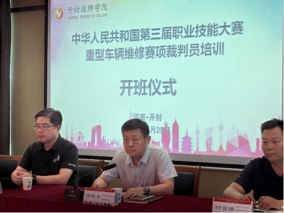 7月29日—8月1日,中华人民共和国第三届职业技能大赛重型车辆维修赛项裁判员培训会在开封技师学院顺利举行,来自全国各地共27名裁判员参加了本次培训。国三赛重型车辆维修赛项裁判长刘庆华教授、河南省职建处副处长乔晓东、开封市人社局党组成员、副局长江静亚、开封市人社局职建科科长时雪锋等领导同志出席了开班仪式,开班仪式由开封技师学院党委副书记、院长涂天鸿主持。