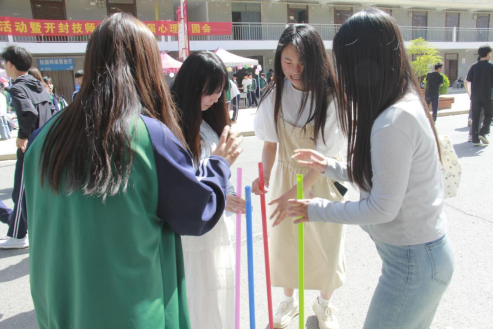 “不倒森林”要求组队的成员同时移动并扶稳手里的PVC管,稍有不慎便会导致“森林倒塌”。 一名参与的同学感慨道:“这个看着简单的游戏让我意识到沟通和合作有多重要!”