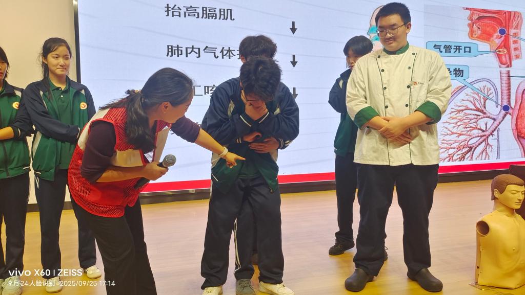 随后,现场学生积极主动上台进行姆立克急救法实操练习,曹爽讲师及时纠正不规范动作,确保大家真正掌握要领。