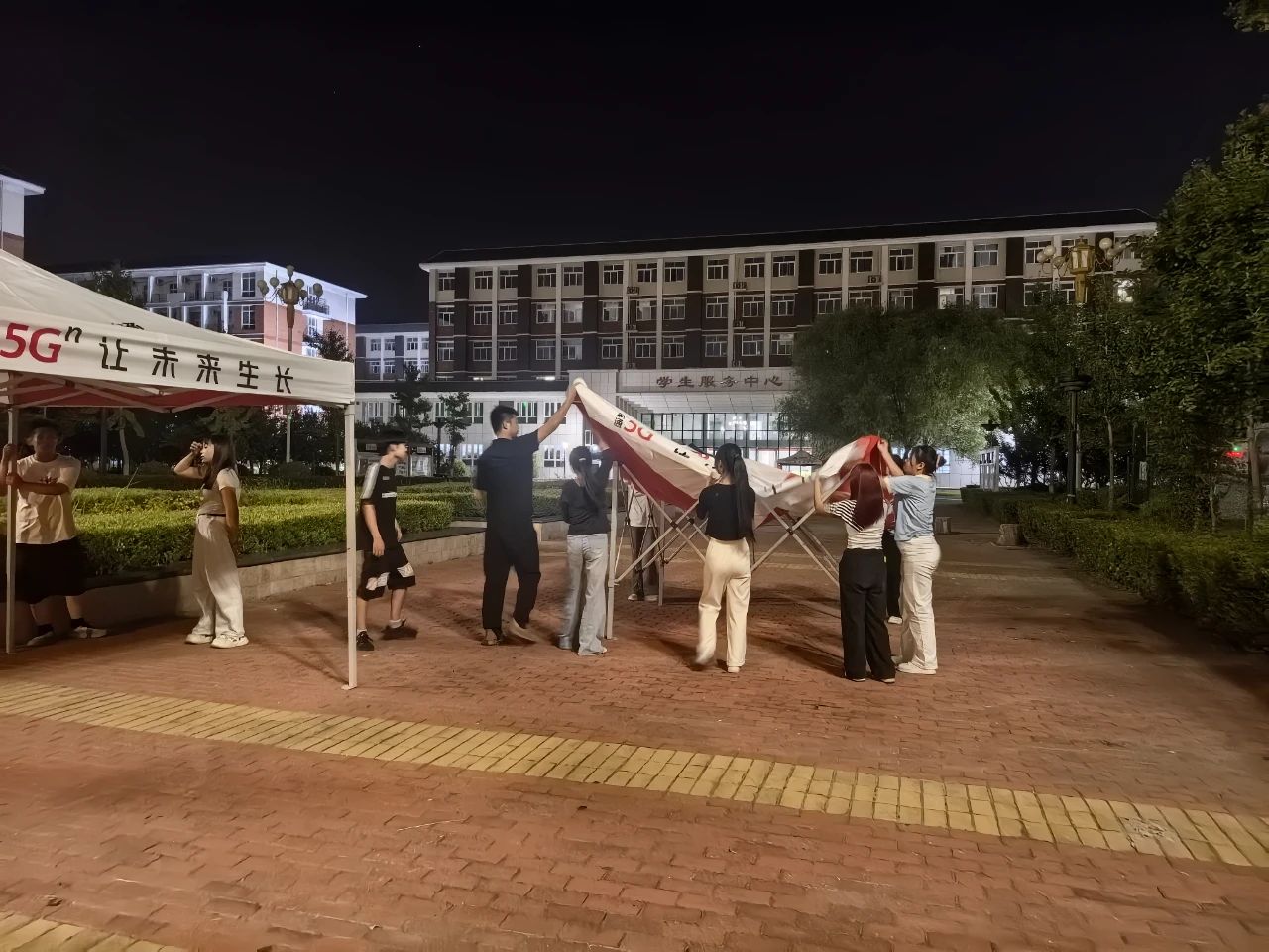 为了在炎炎夏日,给新生和家长带来一丝清凉,志愿者们连夜搭建帐篷长廊。