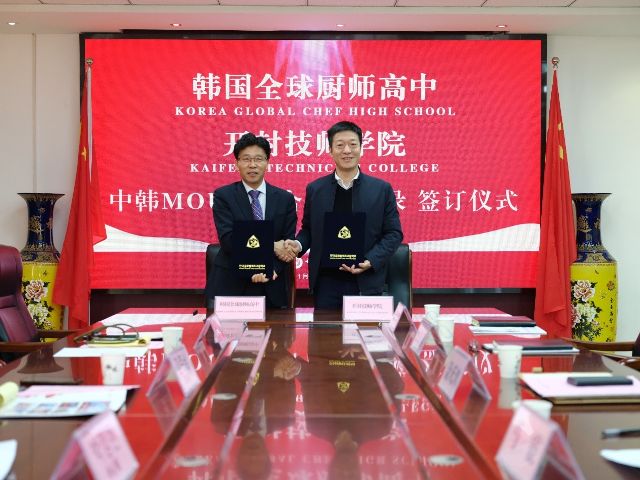 近日,开封技师学院与韩国全球厨师高中《中韩MOU友好交流合作备忘录》签订仪式在开封技师学院隆重举行。韩国全球厨师高中对外合作部部长金周南一行与开封技师学院院长涂天鸿、副院长马震及两校师生代表出席签订仪式。
