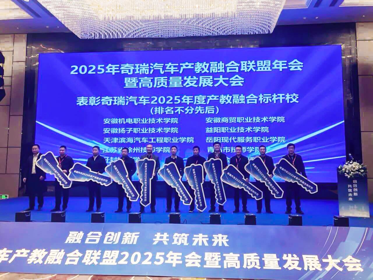 我院党委书记樊清忠、智慧交通学院院长张国青应邀出席会议。会上,我院凭借在产教融合、技能人才培养领域的突出表现,获评奇瑞汽车2025年度产教融合标杆院校。樊清忠被聘为奇瑞汽车产教融合联盟专家顾问委员会专家顾问。