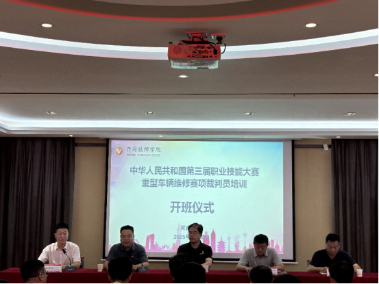 7月29日—8月1日,中华人民共和国第三届职业技能大赛重型车辆维修赛项裁判员培训会在开封技师学院顺利举行,来自全国各地共27名裁判员参加了本次培训。国三赛重型车辆维修赛项裁判长刘庆华教授、河南省职建处副处长乔晓东、开封市人社局党组成员、副局长江静亚、开封市人社局职建科科长时雪锋等领导同志出席了开班仪式,开班仪式由开封技师学院党委副书记、院长涂天鸿主持。