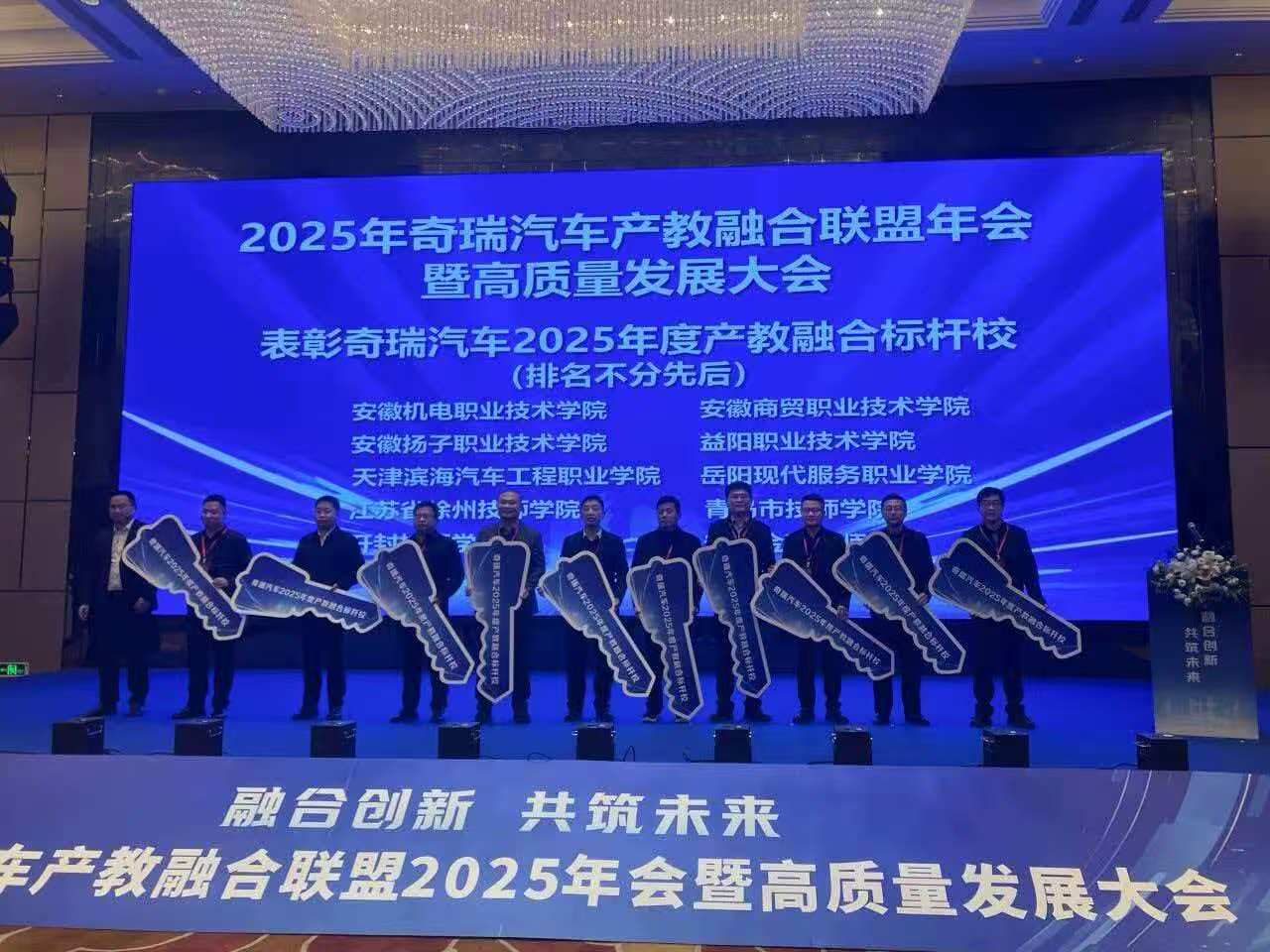 我院党委书记樊清忠、智慧交通学院院长张国青应邀出席会议。会上,我院凭借在产教融合、技能人才培养领域的突出表现,获评奇瑞汽车2025年度产教融合标杆院校。樊清忠被聘为奇瑞汽车产教融合联盟专家顾问委员会专家顾问。